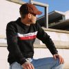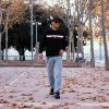 Sudadera 50% algodón, 50% poliéster, 280 gr de color negro. Cuello, puños y cintura en tejido canalé. Franjas grana/blanco en el pecho con bordado Infamous Division. Etiqueta cosida en la manga. Producto 100% diseñado, producido y manufacturado en Cataluña.